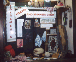 Display window at local library for Sacramento Weavers & Spinners Guild